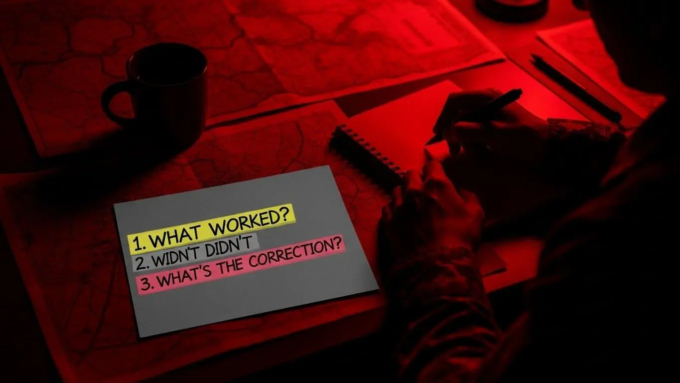 Ao fechar o recinto do dia, faça o que os generais chamam de debrief: uma revisão breve, honesta e sem julgamentos. Em vez de ruminar falhas, concentre-se em três perguntas diretas que atuam como manobra tática: O que funcionou hoje? O que não funcionou? Qual será a única correção amanhã? Reserve dois a cinco minutos antes de dormir para responder isto — por escrito ou mentalmente — com a clareza de quem mapeia terreno para a próxima operação.